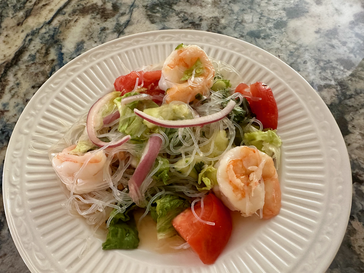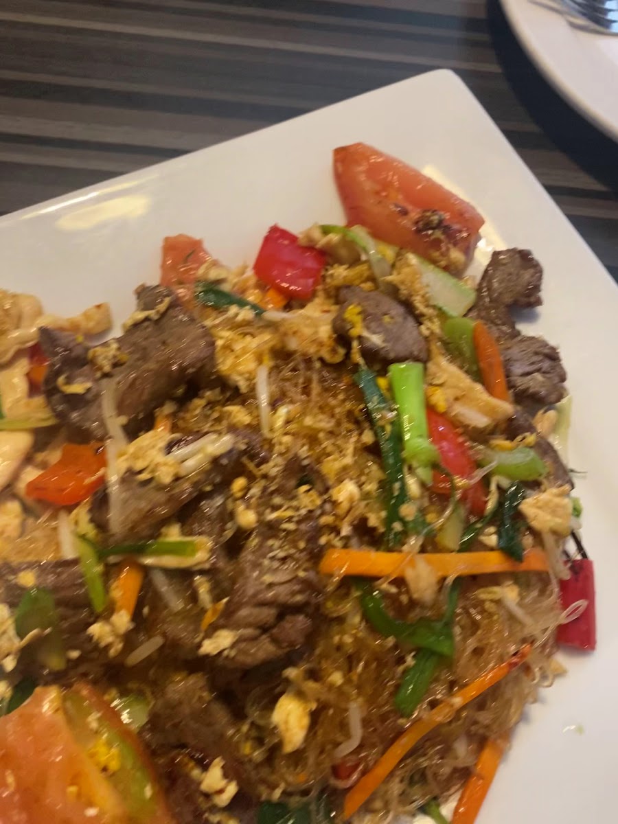 The food is good here and the portions are huge. The pluses are that the ingredients are very fresh and the food is flavorful. I loved the complementary Tom Yum soup. We both had chicken dishes and while the sauces and vegetables were great, the chicken was rather ho-hum, like it was cooked in a big batch plain, and then added to the dish rather than being cooked in the dish. I could be wrong, though. I'll get shrimp next time. The kitchen forgot to put the cashews in the cashew chicken but that was made right as soon as we pointed it out. I got the shrimp glass noodle salad on the side, knowing I would take some home, and wow, it was a LOT. They hid the shrimp, as you'll note in the picture, and there were way too many noodles, but there were loads of shrimp, perhaps 10, and they were large. The last picture is the salad I plated out of the leftovers, with way less noodles.The eggroll at the beginning was a nice surprise, and its sauce was delicious, but I wish the sauce had been on the side because it got a little soggy. This is a minor detail, though. The sauce was so good that I poured it over my glass noodles salad. I think our server was new and there are always a few hiccups, but they were caring. One of the more senior staff members noticed that I wasn't eating much of the glass noodles / shrimp salad and was concerned that I might not like it. I reassured her that it was just that I was gettin full and I ordered it to have a take-home for lunch the next day. I will definitely go back and try this restaurant again.